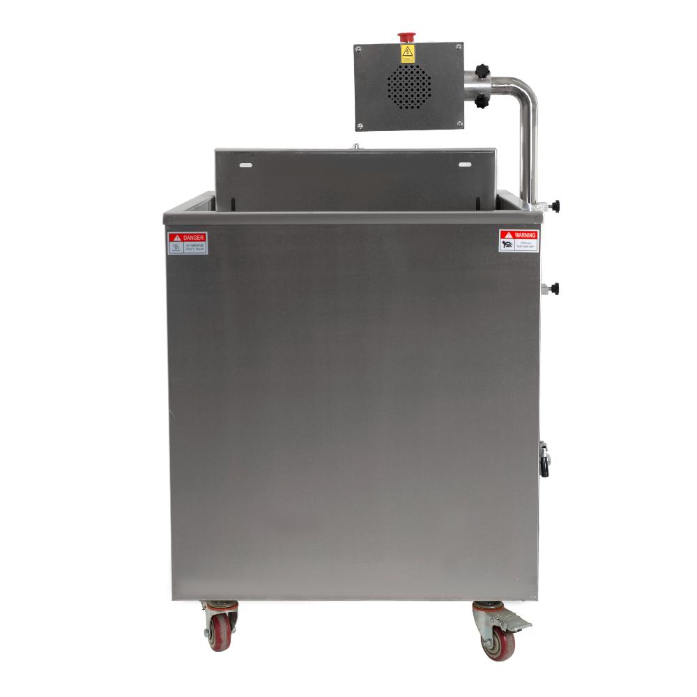 - Затем упаковка с продуктом помещается на платформу термотанка и опускается в ёмкость с горячей водой на 2–3 секунды. Этого времени достаточно для усаживания пакета.