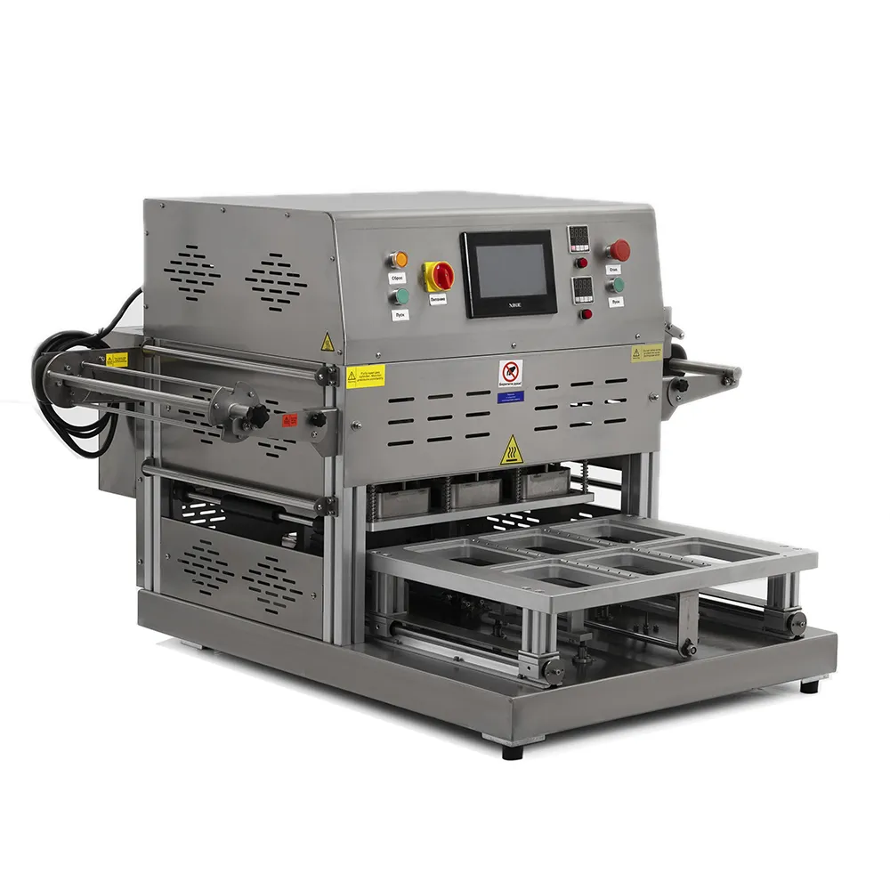 - это полуавтоматический аппарат для герметичной упаковки пищевых продуктов в готовые лотки (контейнеры) из пластика или алюминия. Оборудование удаляет воздух из упаковки и замещает его инертным газом (например, азотом), после чего термосваривает многослойную плёнку и обрезает её точно по контуру лотка. Модель оснащена комплектной матрицей размером 6 лотков размерами 187x137 мм, подходит для предприятий общественного питания, цехов по производству полуфабрикатов, мясной и мучной продукции, супермаркетов.